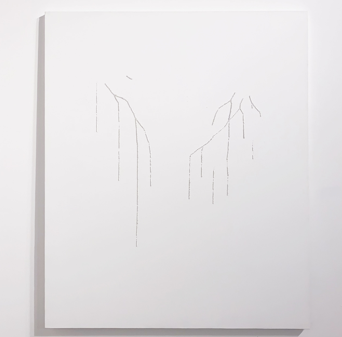 Distillates of the most honest human reactions, which cannot be hidden, and without which nothing can happen. This is a series of dynamic paintings imprinted on canvas with the help of bead threads that move from the slightest touch. This material gives the pieces a fragile, flowing quality. The viewer can open the threads and dry the canvases, flood the space with beads, leaving only subtle traces on the surface of the work.