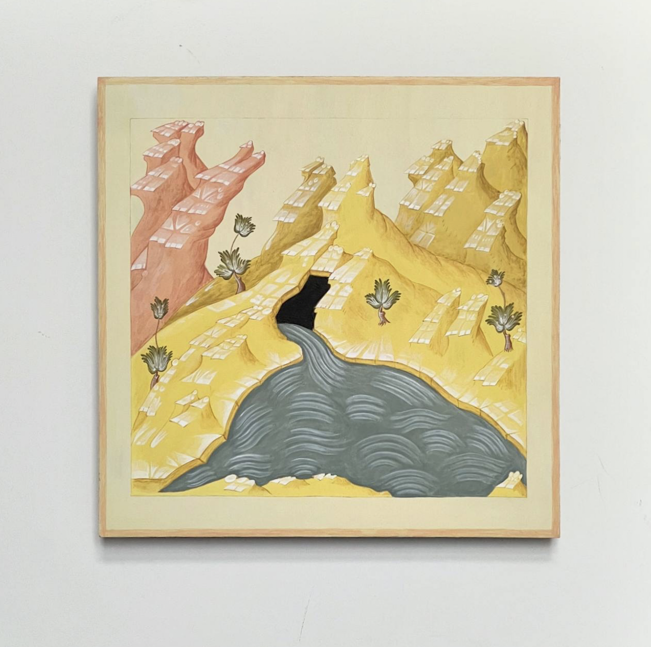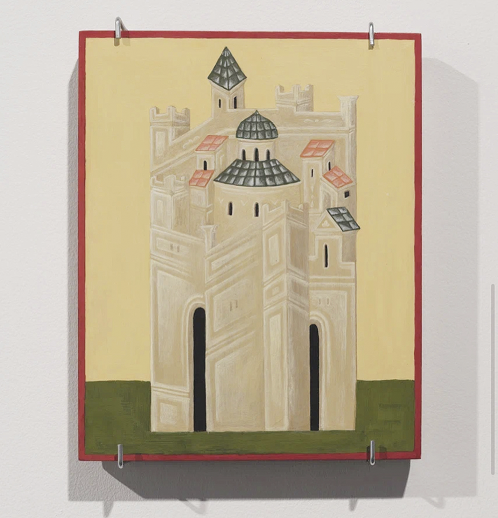 The project explores the architecture of Russian Orthodox icons. By treating form as content, the space of the icon, which usually serves as decoration, takes center stage. Grass, mountains, plants, houses, land, and flowers dictate a new narrative and remind us of a life that, one way or another, runs as a common thread through the lives of all saints and living beings. The project consists of paintings created based on the study of architectural representation, the properties of reverse perspective typical of ancient Russian and Byzantine iconography.