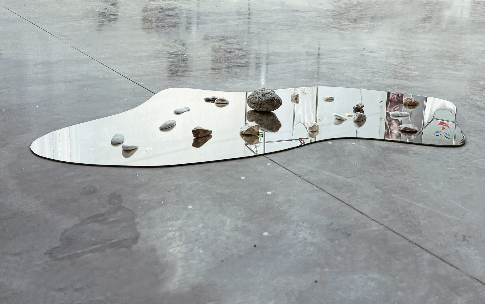 The installation represents the stone located on the mirror. The stone is surrounded by other objects, which are sinking and dissolving into the reflection.