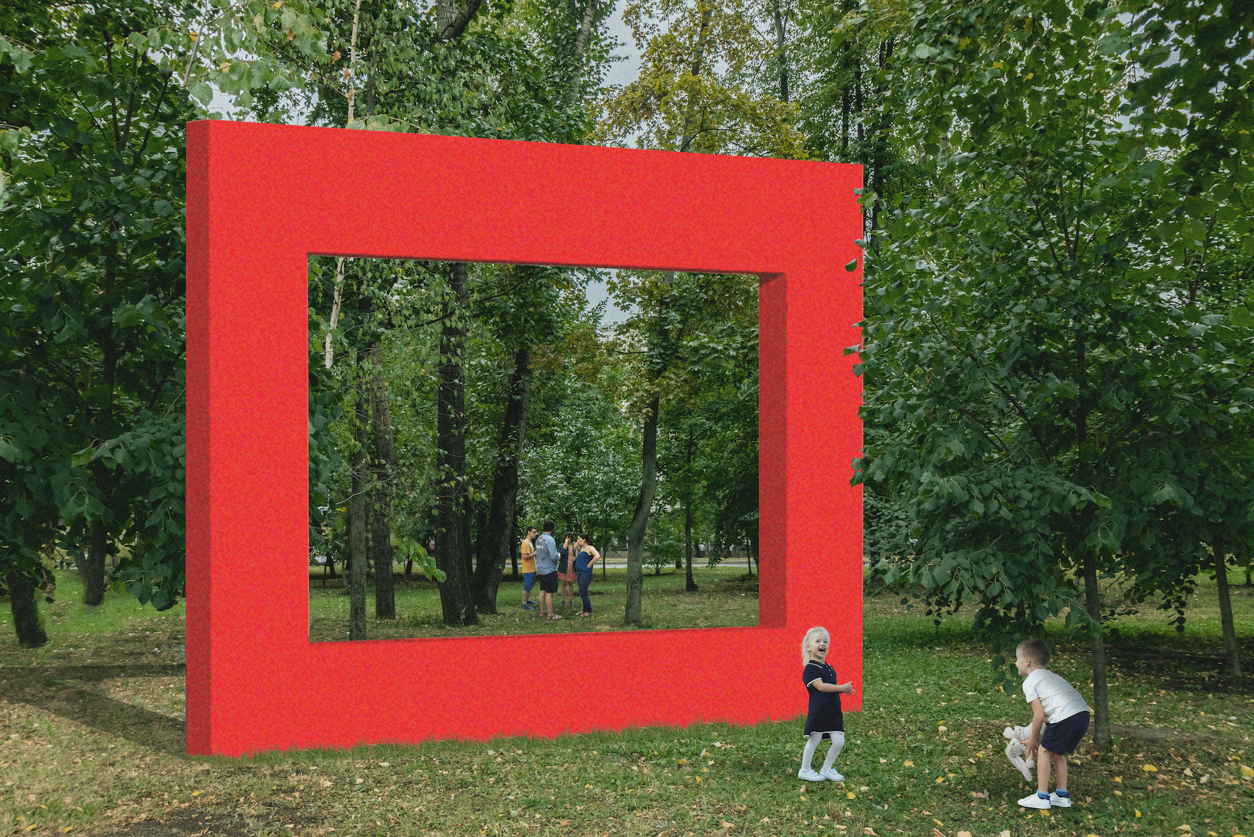 The red frame of the calendar puts us in the present moment. The sculpture itself organizes space and time in the moment. The word "moment" comes from the Latin "Momentum", meaning "driving force." Momentum Monument.