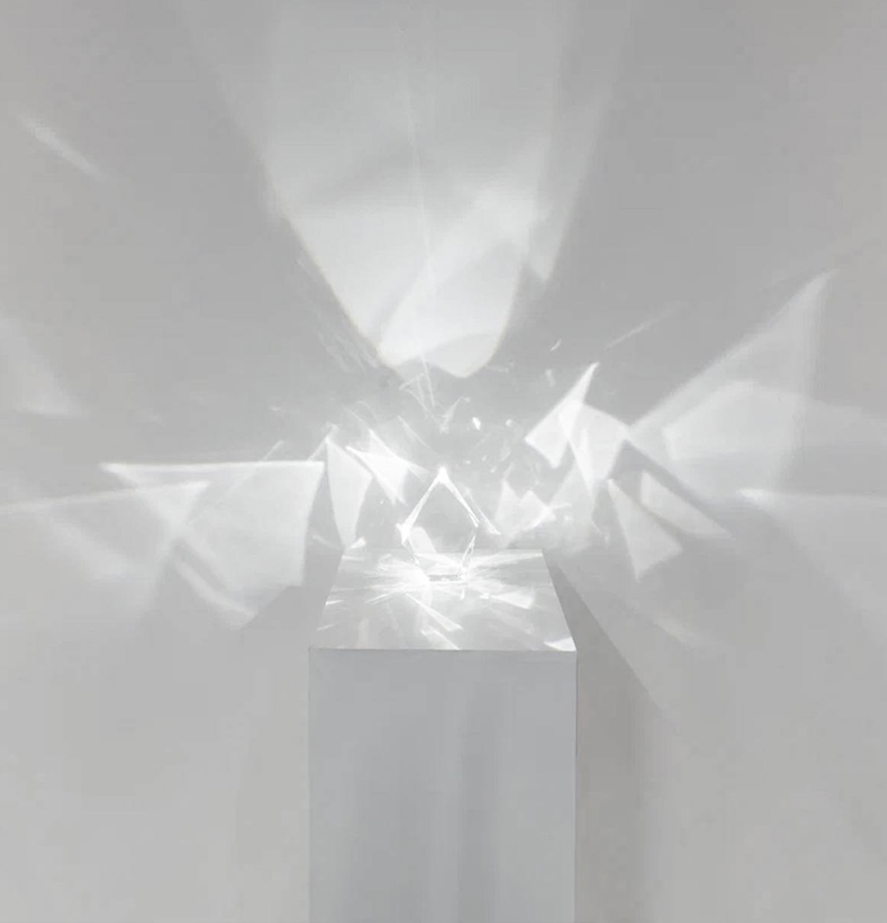 Voids are vast cosmic expanses devoid of galaxies, stars, or planets, inhabited solely by emptiness. These spaces of cosmic clarity are represented by small sculptures made of optical glass that reflect and refract light, much like how emptiness, when seen from a different perspective, alters our reality.
